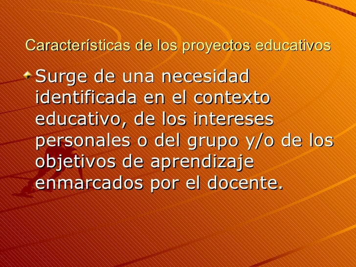 - 10. Características de los proyectos educativos <ul><li>Surge de una necesidad identificada en el contexto educativo, de los intereses personales o del grupo y/o de los objetivos de aprendizaje enmarcados por el docente. </li></ul>