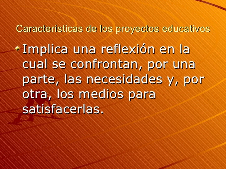 - 11. Características de los proyectos educativos <ul><li>Implica una reflexión en la cual se confrontan, por una parte, las necesidades y, por otra, los medios para satisfacerlas. </li></ul>