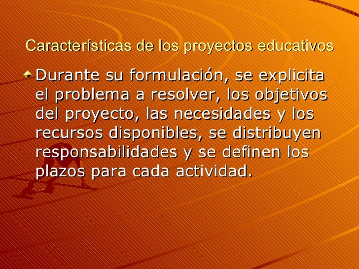 - 12. Características de los proyectos educativos <ul><li>Durante su formulación, se explicita el problema a resolver, los objetivos del proyecto, las necesidades y los recursos disponibles, se distribuyen responsabilidades y se definen los plazos para cada actividad. </li></ul>