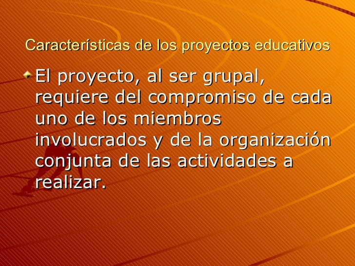 - 13. Características de los proyectos educativos <ul><li>El proyecto, al ser grupal, requiere del compromiso de cada uno de los miembros involucrados y de la organización conjunta de las actividades a realizar. </li></ul>