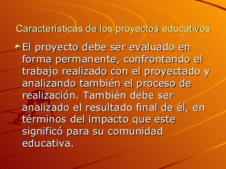 - 14. Características de los proyectos educativos <ul><li>El proyecto debe ser evaluado en forma permanente, confrontando el trabajo realizado con el proyectado y analizando también el proceso de realización. También debe ser analizado el resultado final de él, en términos del impacto que este significó para su comunidad educativa. </li></ul>