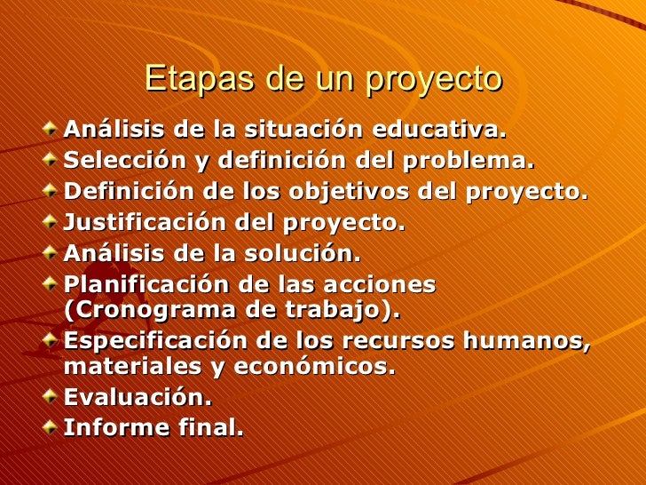 - 16. Etapas de un proyecto <ul><li>Análisis de la situación educativa. </li></ul><ul><li>Selección y definición del problema. </li></ul><ul><li>Definición de los objetivos del proyecto. </li></ul><ul><li>Justificación del proyecto. </li></ul><ul><li>Análisis de la solución. </li></ul><ul><li>Planificación de las acciones (Cronograma de trabajo). </li></ul><ul><li>Especificación de los recursos humanos, materiales y económicos. </li></ul><ul><li>Evaluación. </li></ul><ul><li>Informe final. </li></ul>