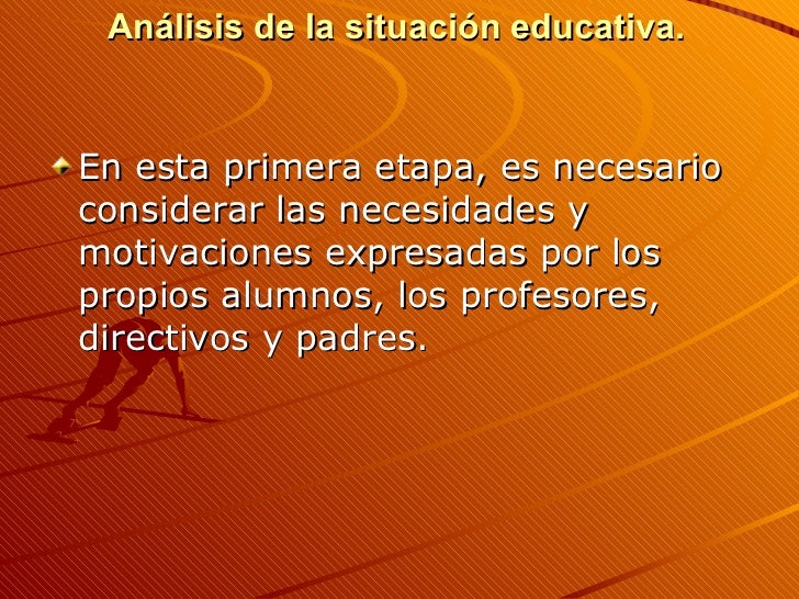 - 17. Análisis de la situación educativa. <ul><li>En esta primera etapa, es necesario considerar las necesidades y motivaciones expresadas por los propios alumnos, los profesores, directivos y padres. </li></ul>
