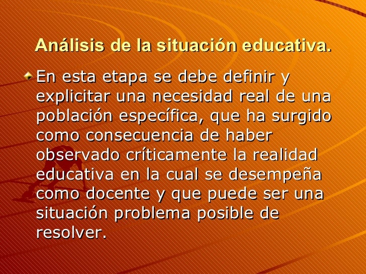 - 18. Análisis de la situación educativa. <ul><li>En esta etapa se debe definir y explicitar una necesidad real de una población específica, que ha surgido como consecuencia de haber observado críticamente la realidad educativa en la cual se desempeña como docente y que puede ser una situación problema posible de resolver. </li></ul>