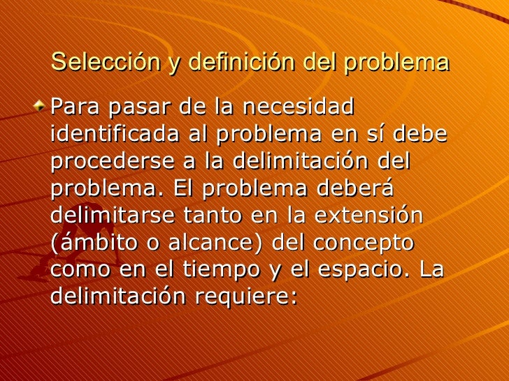 - 21. Selección y definición del problema <ul><li>Para pasar de la necesidad identificada al problema en sí debe procederse a la delimitación del problema. El problema deberá delimitarse tanto en la extensión (ámbito o alcance) del concepto como en el tiempo y el espacio. La delimitación requiere: </li></ul>