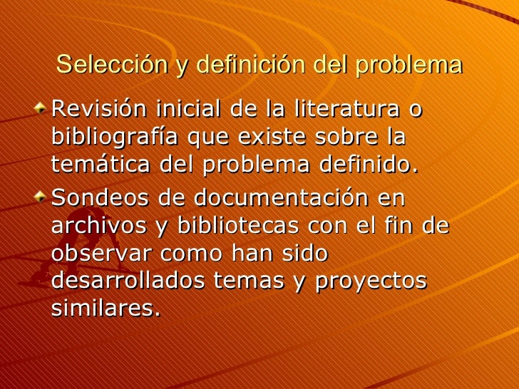 - 22. Selección y definición del problema <ul><li>Revisión inicial de la literatura o bibliografía que existe sobre la temática del problema definido. </li></ul><ul><li>Sondeos de documentación en archivos y bibliotecas con el fin de observar como han sido desarrollados temas y proyectos similares. </li></ul>