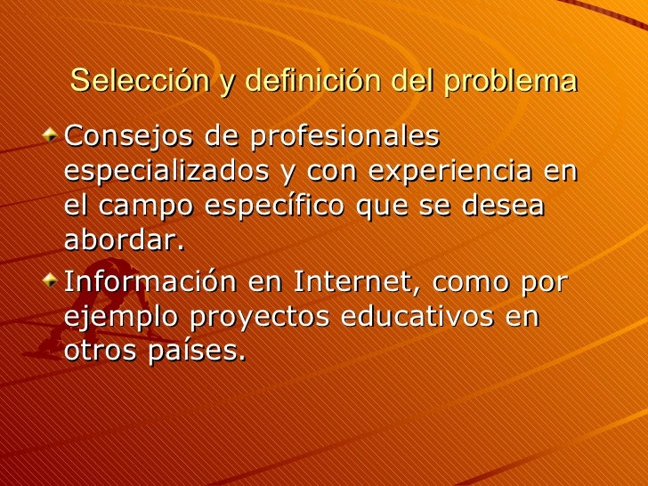 - 23. Selección y definición del problema <ul><li>Consejos de profesionales especializados y con experiencia en el campo específico que se desea abordar. </li></ul><ul><li>Información en Internet, como por ejemplo proyectos educativos en otros países. </li></ul>