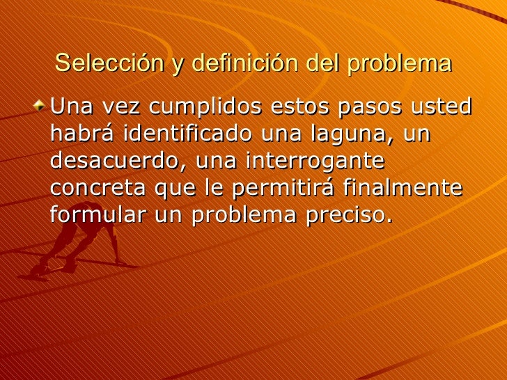 - 24. Selección y definición del problema <ul><li>Una vez cumplidos estos pasos usted habrá identificado una laguna, un desacuerdo, una interrogante concreta que le permitirá finalmente formular un problema preciso. </li></ul>