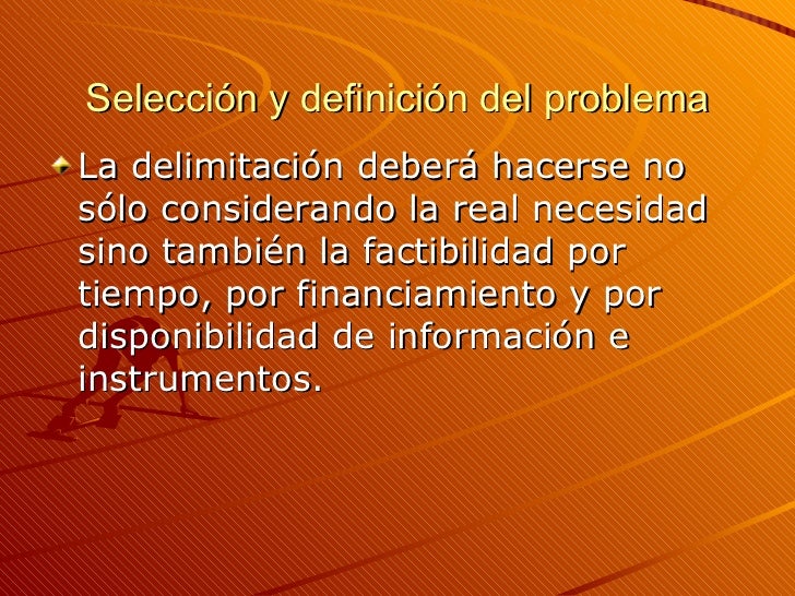 - 25. Selección y definición del problema <ul><li>La delimitación deberá hacerse no sólo considerando la real necesidad sino también la factibilidad por tiempo, por financiamiento y por disponibilidad de información e instrumentos. </li></ul>