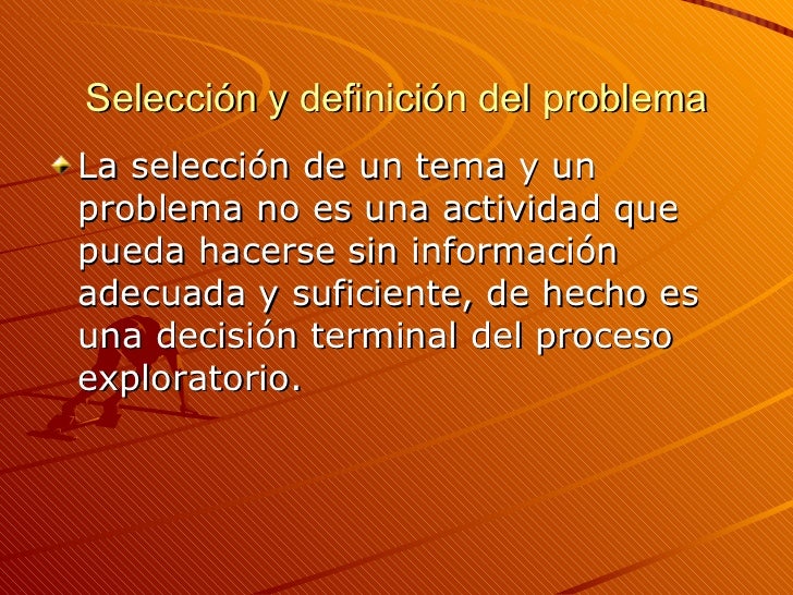 - 27. Selección y definición del problema <ul><li>La selección de un tema y un problema no es una actividad que pueda hacerse sin información adecuada y suficiente, de hecho es una decisión terminal del proceso exploratorio. </li></ul>