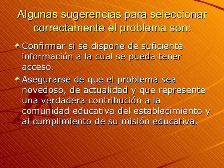 - 29. Algunas sugerencias para seleccionar correctamente el problema son: <ul><li>Confirmar si se dispone de suficiente información a la cual se pueda tener acceso. </li></ul><ul><li>Asegurarse de que el problema sea novedoso, de actualidad y que represente una verdadera contribución a la comunidad educativa del establecimiento y al cumplimiento de su misión educativa. </li></ul>