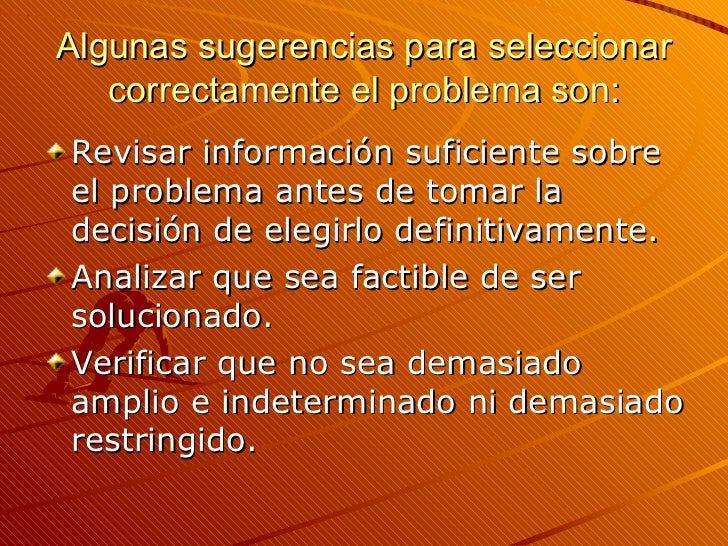 - 30. Algunas sugerencias para seleccionar correctamente el problema son: <ul><li>Revisar información suficiente sobre el problema antes de tomar la decisión de elegirlo definitivamente. </li></ul><ul><li>Analizar que sea factible de ser solucionado. </li></ul><ul><li>Verificar que no sea demasiado amp