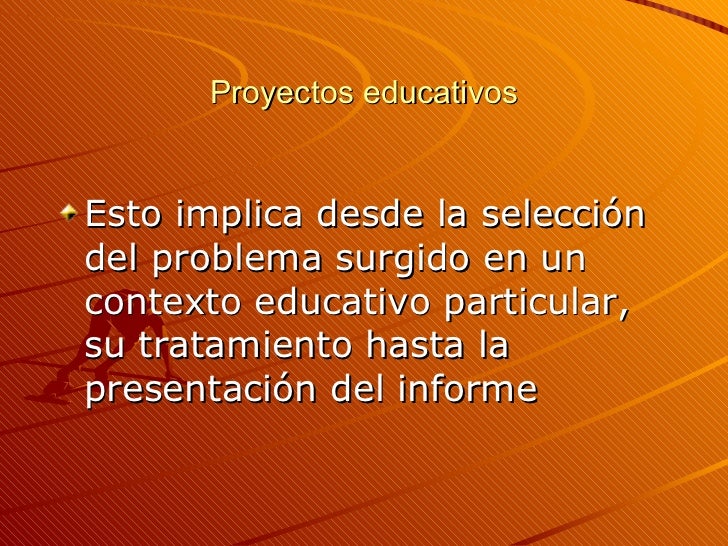 - 4. Proyectos educativos <ul><li>Esto implica desde la selección del problema surgido en un contexto educativo particular, su tratamiento hasta la presentación del informe </li></ul>