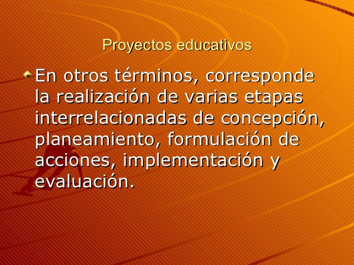 - 5. Proyectos educativos <ul><li>En otros términos, corresponde la realización de varias etapas interrelacionadas de concepción, planeamiento, formulación de acciones, implementación y evaluación. </li></ul>