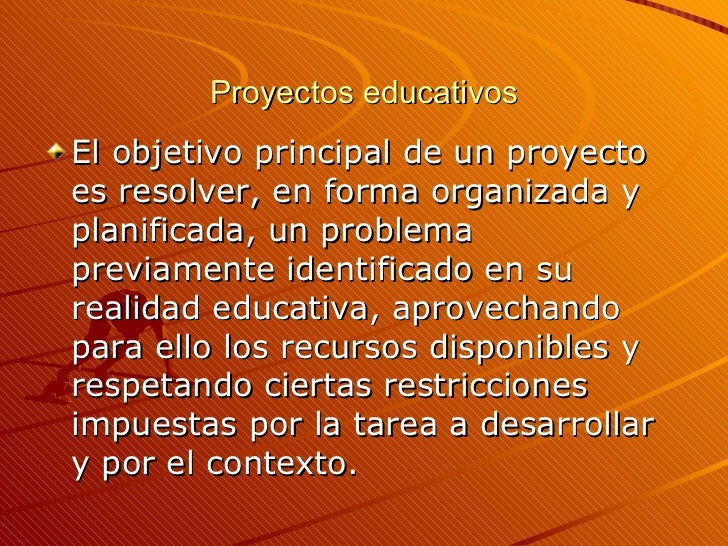 - 6. Proyectos educativos <ul><li>El objetivo principal de un proyecto es resolver, en forma organizada y planificada, un problema previamente identificado en su realidad educativa, aprovechando para ello los recursos disponibles y respetando ciertas restricciones impuestas por la tarea a desarrollar y por el contexto. </li></ul>