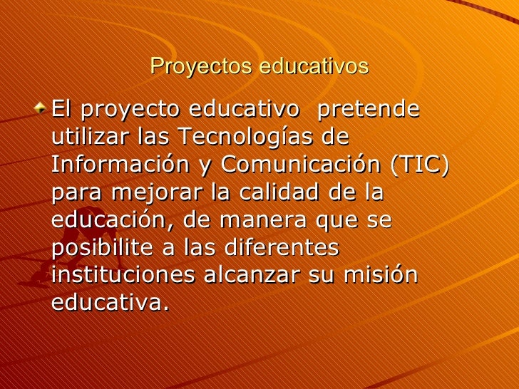 - 7. Proyectos educativos <ul><li>El proyecto educativo pretende utilizar las Tecnologías de Información y Comunicación (TIC) para mejorar la calidad de la educación, de manera que se posibilite a las diferentes instituciones alcanzar su misión educativa. </li></ul>