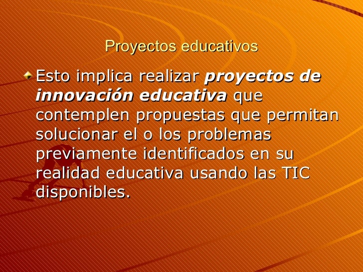 - 8. Proyectos educativos <ul><li>Esto implica realizar proyectos de innovación educativa que contemplen propuestas que permitan solucionar el o los problemas previamente identificados en su realidad educativa usando las TIC disponibles. </li></ul>