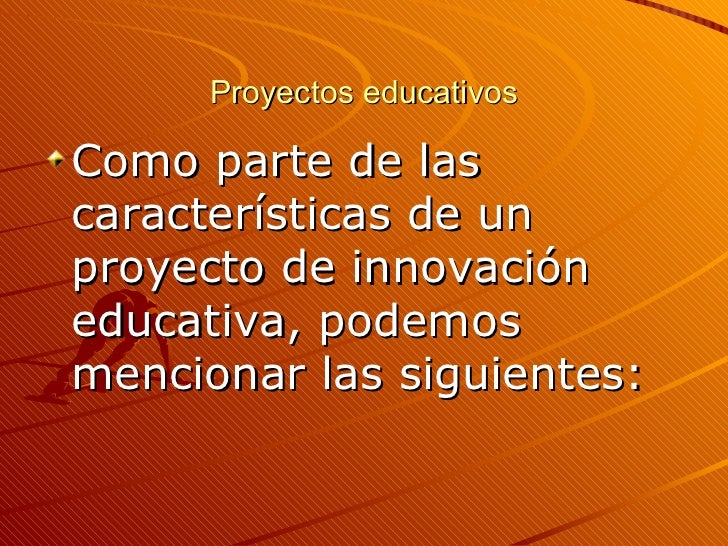 - 9. Proyectos educativos <ul><li>Como parte de las características de un proyecto de innovación educativa, podemos mencionar las siguientes: </li></ul>